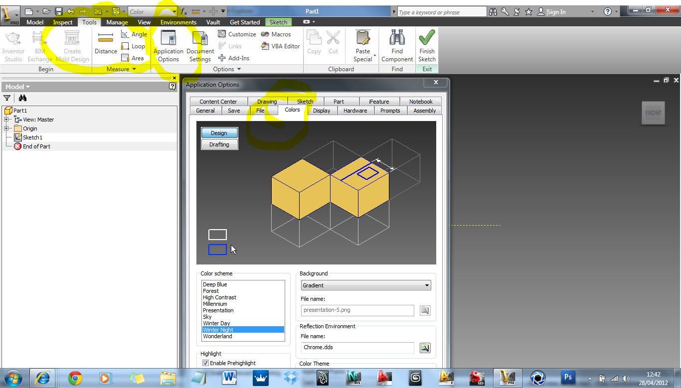 Change Inventor Drawing Sheet Color Imaginit Manufacturing Solutions Blog - Additionally, if you use inventor during a presentation or training, the white background used in the presentation color scheme often shows up best, but again the yellow projected lines makes it difficult to work with, particularly with some projectors.