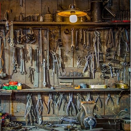 Amazon Com Csfoto 8x8ft Garage Backdrop Equipment Fix Garage Grunge Grimy Vintage Tools Workshop Hammer Backdrop Live Video Wallpaper Camera Photo - 570x384 hyde tools vintage wallpaper casing corner knife no 75 circa.